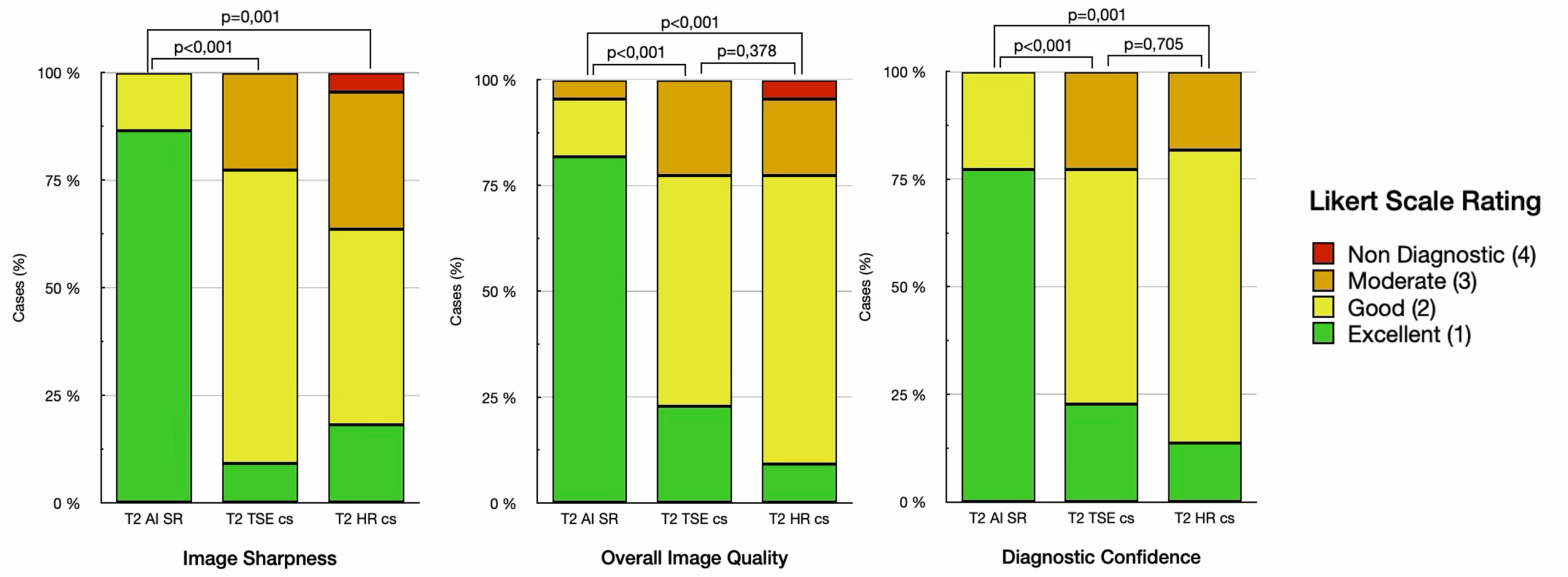 Qualitative Expert Evaluation: The AI sequence was rated significantly superior to both Conventional and HR sequences in Image Sharpness, Tissue Contrast, Overall Image Quality, and Diagnostic Confidence (all p<0.001). Expert noted marked improvement in the delineation of fine anatomical structures.