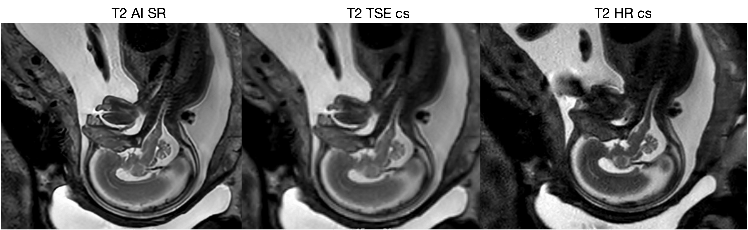 T2 TSE cs: Conventional sequence, accelerated with compressed sense (CS), T2 AI SR: The same accelerated sequence with AI post-processing, T2 HR cs: Standard time-intensive High Resolution sequence.